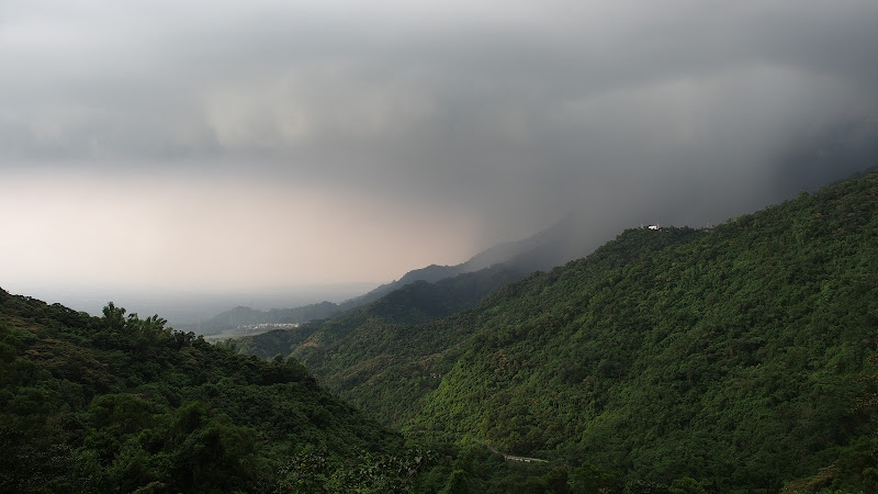 怕被這波雨勢趕上,趕緊騎車到山下去,看紫心樓一帶已經被雲霧壟罩 |
